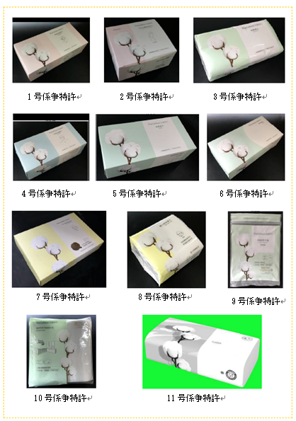 係爭専利はすべて柔らかい布製品の包裝用の箱および袋であり、相似する設計の要素と特徴を有する。意匠の出願日はそのうち10件が2017年6月5日、1件が2019年1月10日、すべての専利に色に対する保護は與えられていない。
