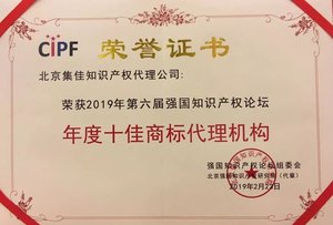• 集佳獲2019第六屆強(qiáng)國知識產(chǎn)權(quán)論壇“十佳商標(biāo)代理機(jī)構(gòu)”榮譽(yù)稱號2月23日,由強(qiáng)國知識產(chǎn)權(quán)論壇組委會和北京強(qiáng)國知識產(chǎn)權(quán)研究院主辦的“2019強(qiáng)國知識產(chǎn)權(quán)論壇新春分享會暨服務(wù)業(yè)頒獎典禮”在北京大學(xué)博雅國際酒店舉行。集佳在本年度強(qiáng)國知識產(chǎn)權(quán)論壇服務(wù)業(yè)“十佳”評比中獲得“年度十佳商標(biāo)代理機(jī)構(gòu)”榮譽(yù)稱號,集佳合伙人趙雷律師參加會議并代表集佳領(lǐng)取榮譽(yù)證書...