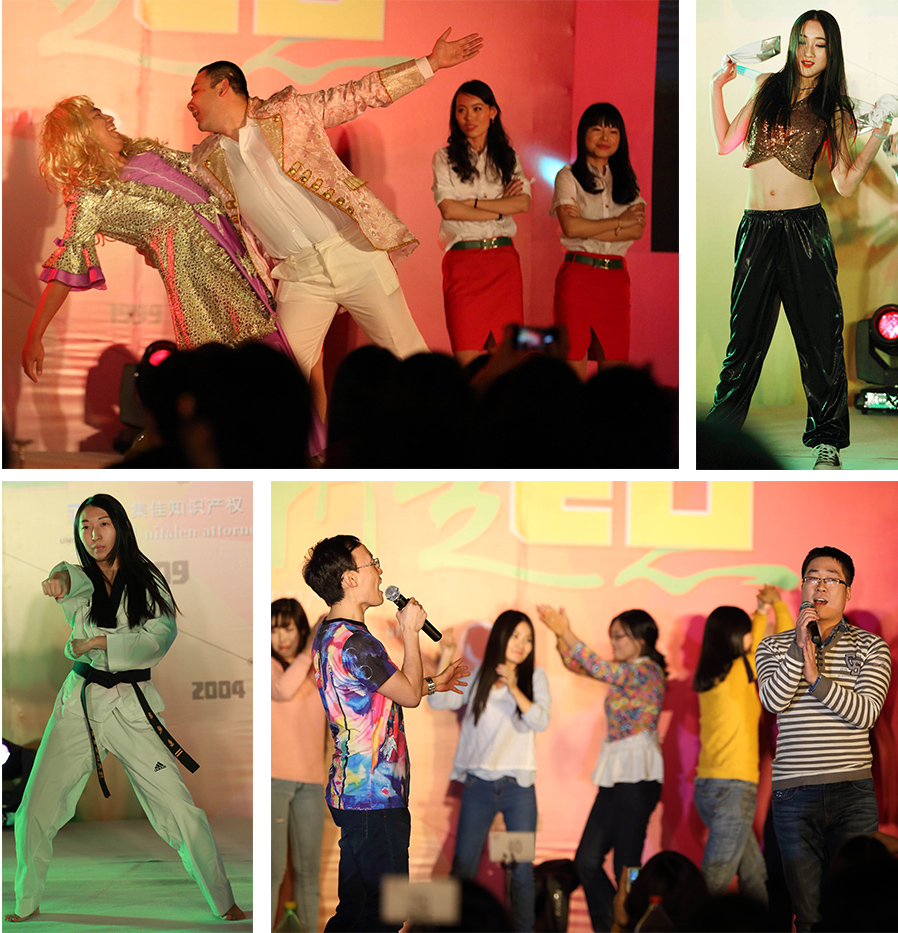 在經久不息的掌聲中,集佳20年年會會議部分圓滿結束,一曲熱情洋溢的《奔跑》活力開場,十幾位青年才俊“歌神”跳上舞臺,熟悉的旋律,高亢的領唱,歌聲很快感染了全場。《集佳,對你愛不完》、《小雞舞》、《小蘋果》、《動感現(xiàn)代舞》紛紛精彩上演,《歌舞串燒》更有國外客戶友情出演,還有穿越大戲《步步蛇精》,匪夷所思的故事情節(jié)吸引了眾人的眼球,《跆拳道舞》由已獲跆拳道黑帶的流程部同事領舞。集佳合伙人也全力打造三句半《四大才子夸集佳》,作為獻給集佳所有員工的一份禮物。