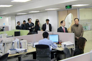 市知識產權局領導在集佳領導的陪同下,首先參觀了位于賽特廣場七層、八層的集佳辦公區,了解了集佳專利、商標等業務部門及流程部門的工作,并對集佳在專利代理、知識產權訴訟以及流程管理等方面的工作給予了肯定。參觀過程中,汪洪局長還對專利時限監控、案卷管理、卷庫規劃等細節問題,與于澤輝所長進行了深入交流。
