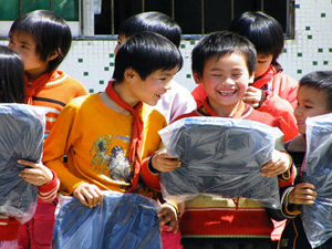 集佳向雷二小學捐贈                   拿到新書包的小學生