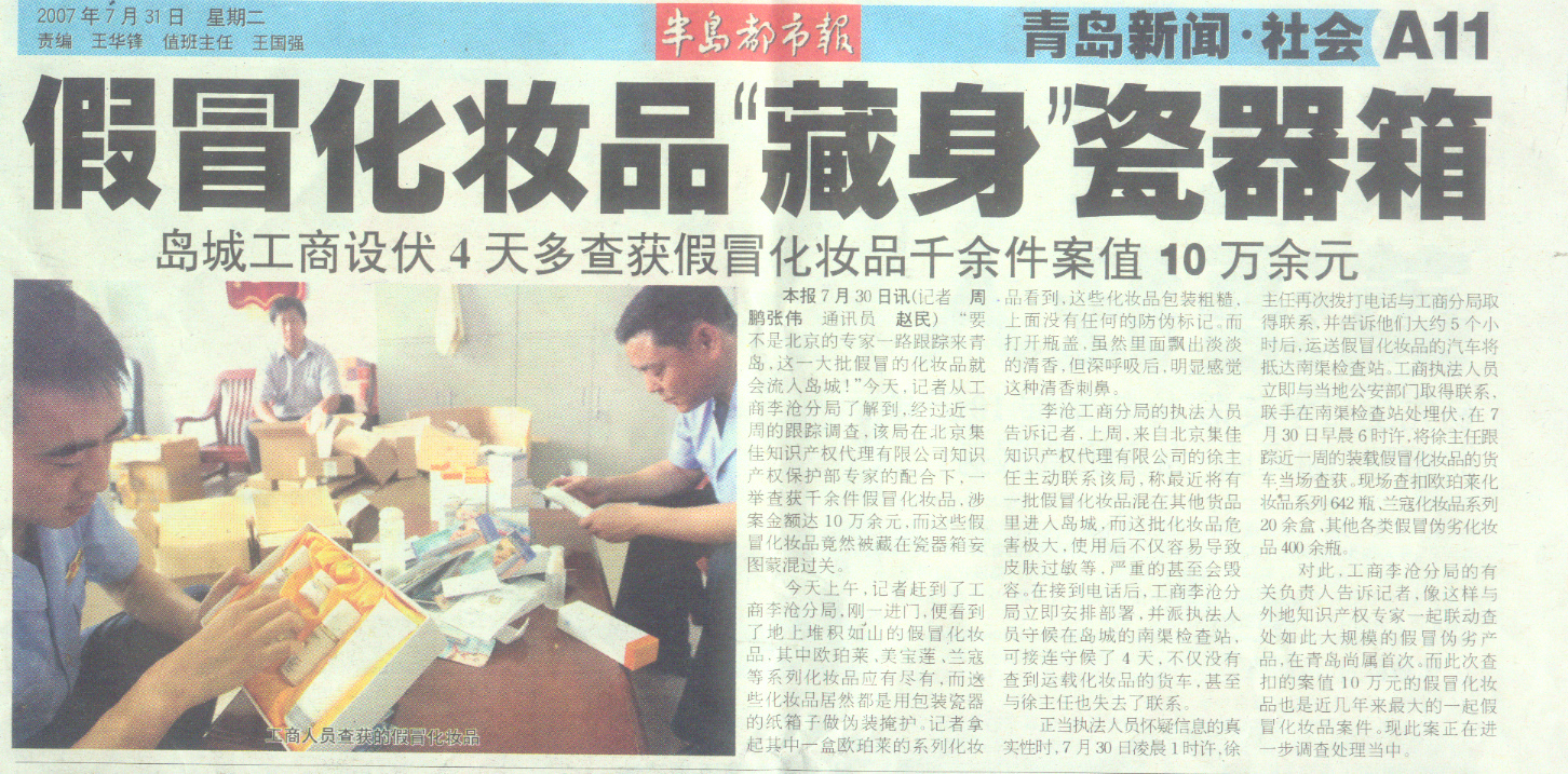集佳聯(lián)合青島市李滄工商分局破獲大規(guī)模假冒化妝品案