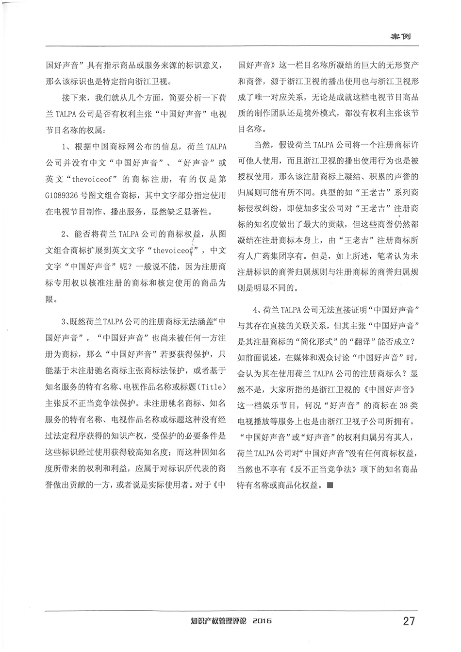 集佳資深律師侯玉靜文章《“中國好聲音”到底屬于誰?——淺談該電視節目名稱的權屬之爭》在《知識產權管理評論》發表