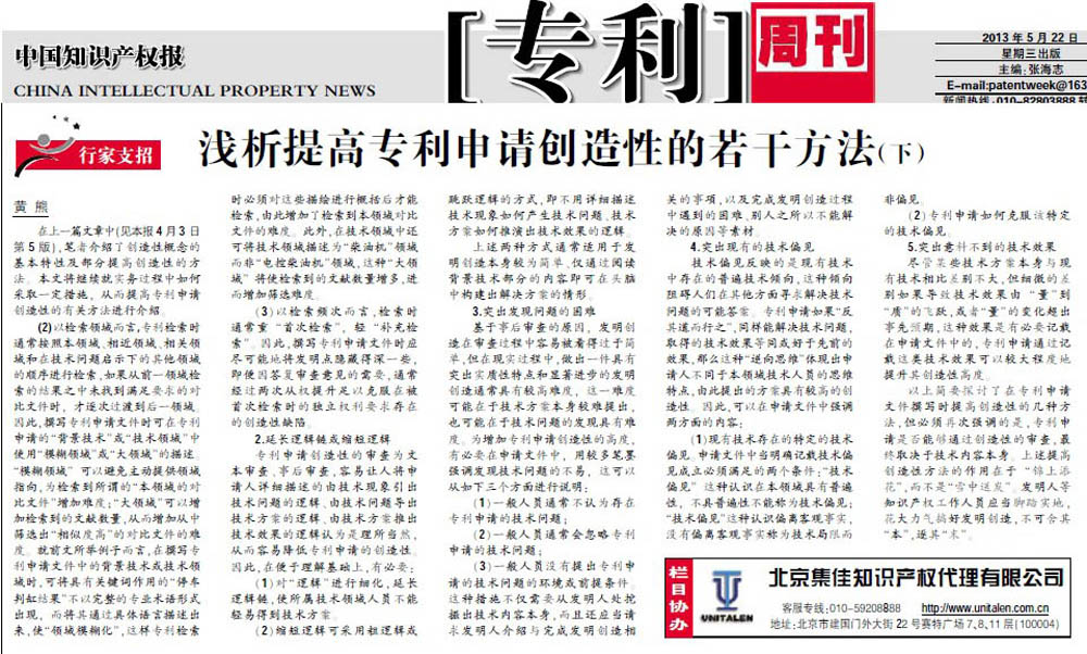 《中國知識產權報》:淺析提高專利申請創造性的若干方法