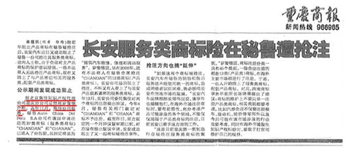 《重慶商報(bào)》:長(zhǎng)安服務(wù)類(lèi)商標(biāo)險(xiǎn)在秘魯遭搶注