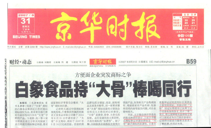 記者昨天通過中國商標網查找發現,白象集團所屬的河南省正龍食品有限公司確于2004年8月31日申請注冊了“大骨”中文商標,商標于2007年6月14日完成注冊,注冊的商品群包括方便面、掛面、面粉制品及面條米粉等。而一家要求撤消“大骨”商標注冊的方便面企業相關人士昨天對記者表示,“大骨”是豬骨、排骨、大骨頭的俗稱,是行業通用的主要原料,不具有商標的“顯著性”。據了解,目前很多企業都有大骨類方便面產品,如果相關產品構成侵權,將面臨更改產品名稱、包裝和宣傳內容等復雜問題,對企業影響較大。