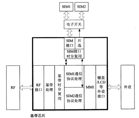 參照上圖,所述單套通信器件實現的雙卡雙待手機包括射頻模塊(RF)、基帶芯片、外設和兩個SIM卡槽(SIM1、SIM2),所述的基帶芯片具有SIM接口時分復用模塊和基帶時分復用模塊,以及SIM1通信協議處理模塊和SIM2通信協議處理模塊,所述的基帶芯片通過SIM接口跟一個同時連接兩個SIM卡槽的電子開關相連,并通過片選模塊對電子開關進行控制。從而在一套手機硬件上實現雙卡同時待機,減少了雙卡手機的體積,降低了成本,使用便捷。