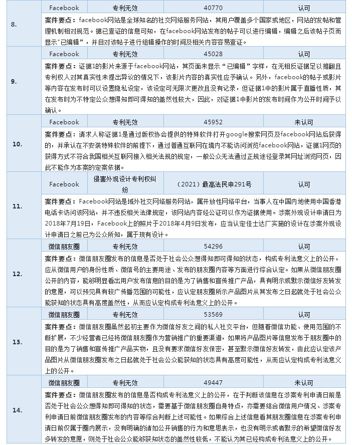 社交網絡類平臺及相關軟件應用因其用戶交互模式的易用性及便捷性擁有數量極為龐大的用戶,由此產生的海量信息中往往蘊含可用作認定為現有技術的證據。常見的社交網絡平臺包括新浪微博、微信公眾平臺、微信朋友圈、Facebook、Twitter等,而不同類型的社交平臺其隱私功能,已發布信息修改功能均有所不同。比如新浪微博用戶在發表微博時,存在私密權限和公開權限的設置,微博公開范圍可以從公開轉成私密,但私密不能轉成公開。而微信朋友圈的公開范圍可以在公開與私密間來回切換且不會影響發布時間,也不會留下編輯痕跡。因此,在實踐中認定此類社交網絡類證據是否構成專利法意義上的公開時,主要的考量的重點為公開性及公開時間。下表是認定社交網絡平臺類網絡證據的案例梳理。
