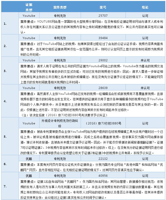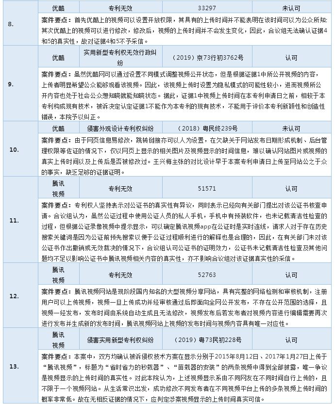 相較于社交平臺類網絡證據,視頻流媒體類網絡證據因其獨特的形式往往蘊含更為豐富的有效信息,并且能夠讓人更為直觀的理解目標信息。對于視頻流媒體類網絡證據的認定規則與社交平臺類網絡證據較為相似,考量的重點不外乎真實性,公開性以及公開時間,但因視頻流媒體平臺的相關隱私權限規則及修改規則較為隱蔽,需要針對平臺規則進行詳細解釋說明。同時應當注意的是,在實踐中由于部分企業存在產品宣傳先行,專利申請滯后的情況,相關視頻的發布者往往是專利權人或其關聯主體。在此種情形下,應當著重審核發布主體的身份用以輔助參考證據的真實性及公開性。下表是認定視頻流媒體類網絡證據的案例梳理。