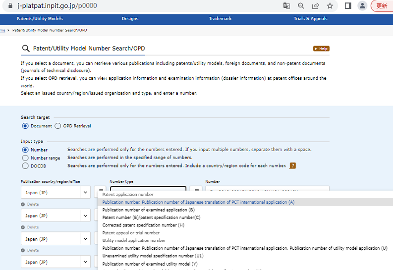 Patent/Utility Model Number Search/OPD:可以檢索各種公開物(包括發(fā)明/實(shí)用新型)或世界各國(guó)專利的申請(qǐng)狀態(tài)和審查狀態(tài)(dossier information)。