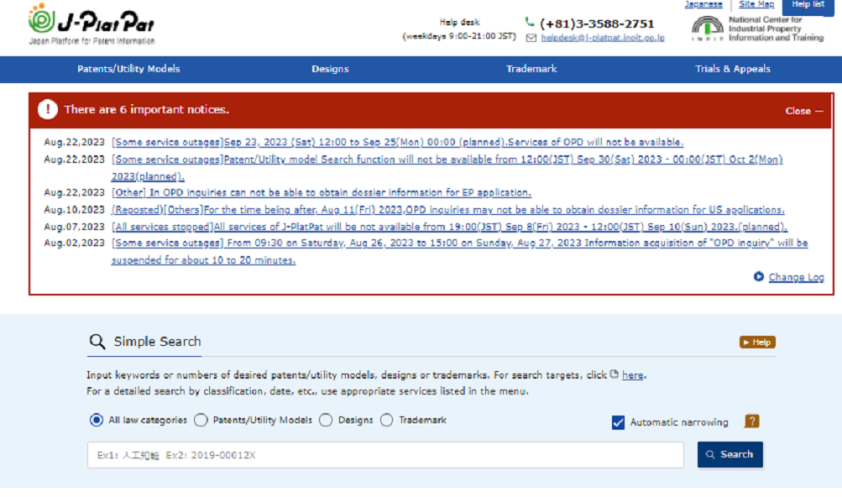 日本專利局將自1885年以來公布的所有日本專利、實(shí)用新型和外觀設(shè)計(jì)電子文獻(xiàn)及檢索系統(tǒng)通過其網(wǎng)站(http://www.jpo.go.jp/)上的工業(yè)產(chǎn)權(quán)數(shù)字圖書館(IPDL)免費(fèi)提供給全世界的公眾查詢,而2015年3月23日上線了日本專利平臺(tái)J-platpat,替代原IPDL系統(tǒng)。J-platpat收錄了1885年以來公布的日本專利、實(shí)用新型和外觀設(shè)計(jì)的信息,提供日文版和英文版兩種語(yǔ)言類型。