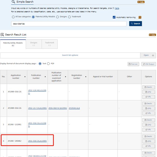 Simple Search能夠檢索出與號(hào)碼S64-036726相關(guān)的所有專利。由“特開”可知該號(hào)碼為發(fā)明公開號(hào),因此結(jié)尾專利類型應(yīng)為“A”,可在Search Result List里找到正確的結(jié)果應(yīng)為JP,01-036726,A(1989)。