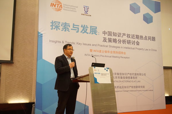 隨后,李永波先生作為主辦方INTA代表發言。他首先感謝集佳多年來對INTA相關工作的大力支持,同時他還表示,INTA 在近幾年與中國的聯系越來越密切,這都離不開所有業內人士和專家們的關注與支持,在此向所有同行以及業界人士表達誠摯的謝意。李永波先生介紹,2019年INTA第141屆年會活動將于5月18~22日在美國波士頓舉行,希望通過本次預熱活動,使國內的代理機構對國際商標協會有更深入的了解,同時希望廣大企業和業界同仁積極關注并參與INTA年會活動。