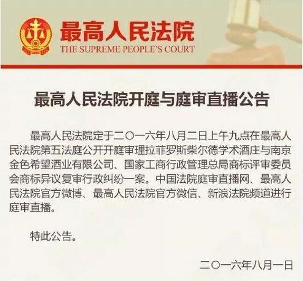 2017年4月24日,最高人民法院發(fā)布“2016年中國法院知識產權司法保護十大案件”,由集佳訴訟團隊代理的“拉菲羅斯柴爾德酒莊與國家工商行政管理總局商標評審委員會、南京金色希望酒業(yè)有限公司商標爭議行政糾紛再審案”榮登榜單。