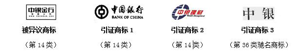 答辯理由和法律依據:被異議商標與引證商標1/2構成類似商品上的近似商標,同時構成對第36類引證商標3“中銀”馳名商標的復制、摹仿,損害了異議人馳名商標權益。違反了《商標法》第十三條第三款和第三十條規定。