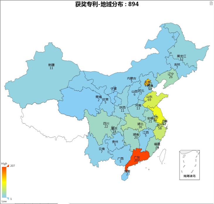 894件獲獎專利中,東部沿海地區的山東(69件)、江蘇(89件)、上海(42件)、浙江(58件)、福建(24)件、廣東(207件)占據了獲獎專利總量的一半以上。