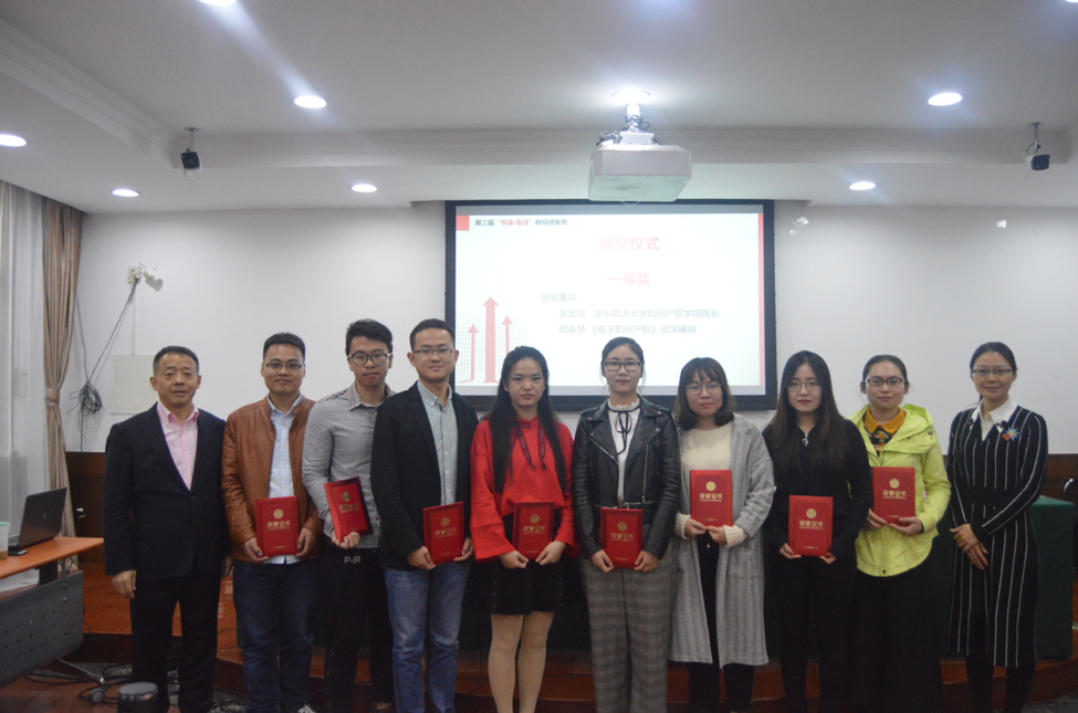 頒獎環節,由黃武雙教授、唐春副教授、李文紅律師、尹臘梅副教授、周春慧編輯、張韜略副教授、郭鵬鵬副教授為獲獎者頒獎。本次競賽共評出一等獎4組,二等獎6組,三等獎8組,提名獎27組,優秀獎30組。