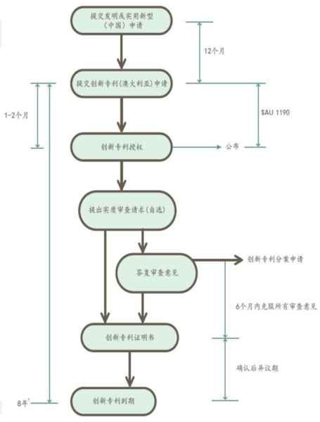 澳大利亞專利分為:標(biāo)準(zhǔn)專利Standard patent(類似中國的發(fā)明)、創(chuàng)新專利innovation patent(類似中國的實(shí)用新型,但也有較多不同之處)、外觀專利。