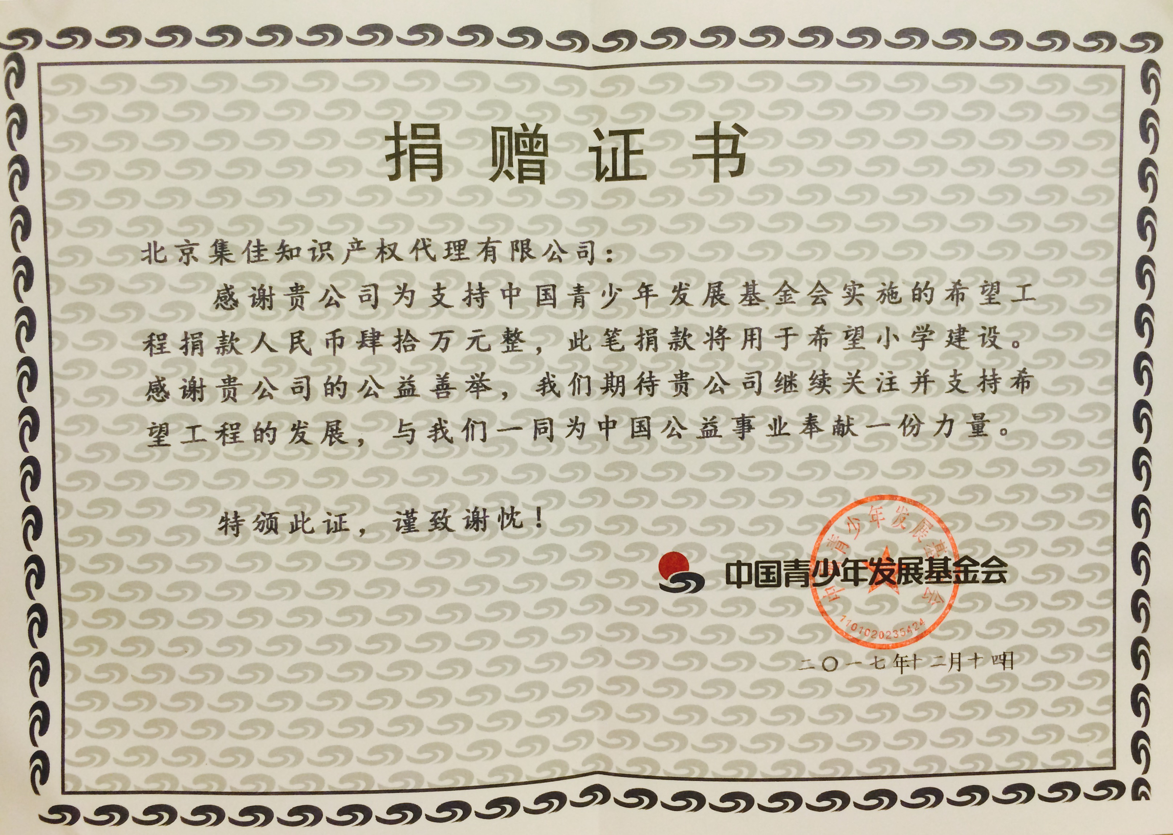 雙旦來臨之際,集佳也迎來了一個好消息。中國青少年發展基金會再一次將援建希望小學的捐贈證書頒給集佳,表示對集佳十幾年如一日踐行“一年建一所集佳希望小學”承諾的感謝。自2006年以來,為了支持中國青少年發展基金會實施“希望工程”,集佳每年都會投入專門款項,用于希望小學建設。