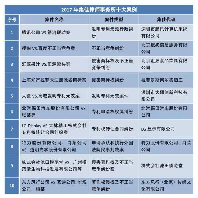 2017年集佳律師事務所十大案例