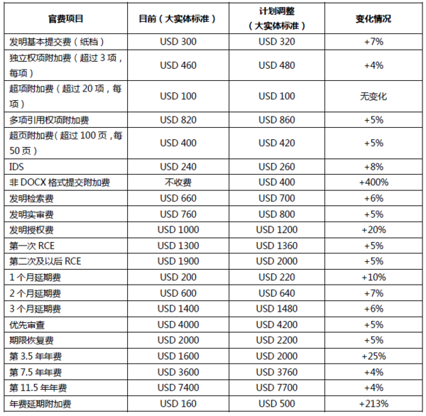 這是美國(guó)近三年來首次大范圍上調(diào)官費(fèi),2019年8月初步公告上調(diào)官費(fèi)計(jì)劃時(shí),預(yù)計(jì)是在2021 年1 月實(shí)施,本次公布的最終結(jié)果是提前到2020年10月2日實(shí)施(除非DOCX格式提交附加費(fèi)延后至2022年1月1日實(shí)施外),并對(duì)初步計(jì)劃進(jìn)行了略微調(diào)整。