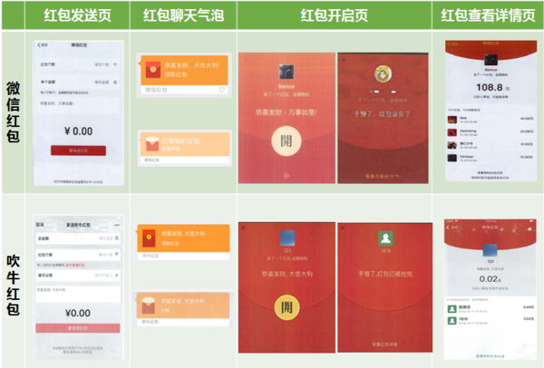 本案緣于被訴“吹牛”軟件在提供的紅包收發(fā)服務過程中,在紅包發(fā)送接收全過程中使用的紅包發(fā)送頁、開啟頁、聊天氣泡、查看詳情頁等界面全面抄襲、模仿原告“微信紅包”相關界面。此外“吹?!避浖羞€提供與騰訊公司享有在先著作權的六幅“微信表情”一致的聊天表情,且其使用與“微信”軟件底部界面“聊天、通訊錄、發(fā)現、我”圖標高度近似的圖標。