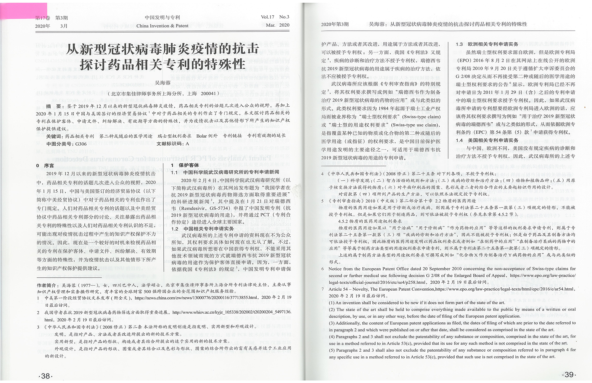 集佳文章《從新型冠狀病毒肺炎疫情的抗擊探討藥品相關專利的特殊性》在《中國發明與專利》發表