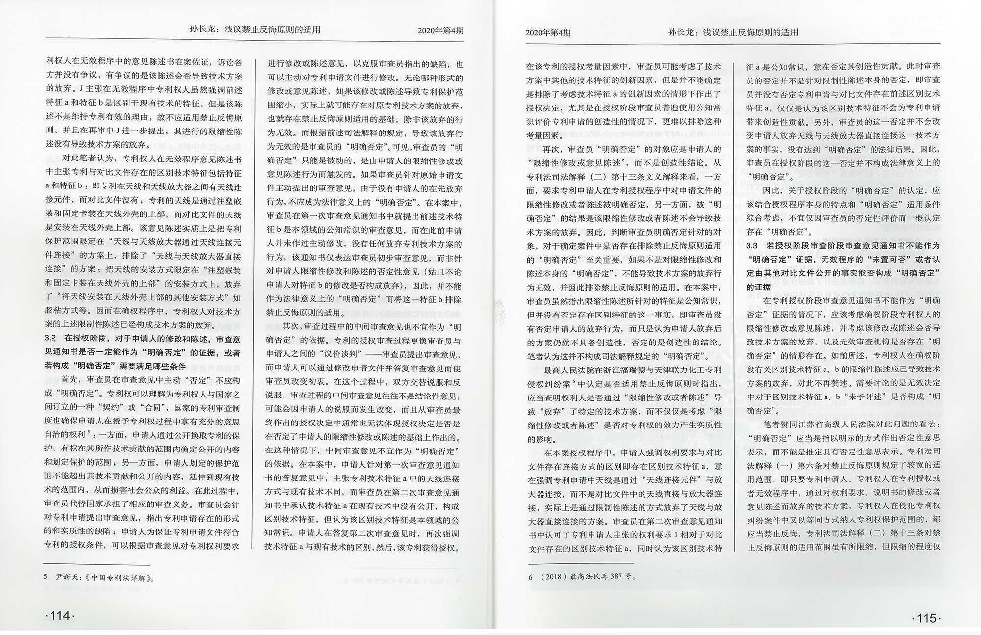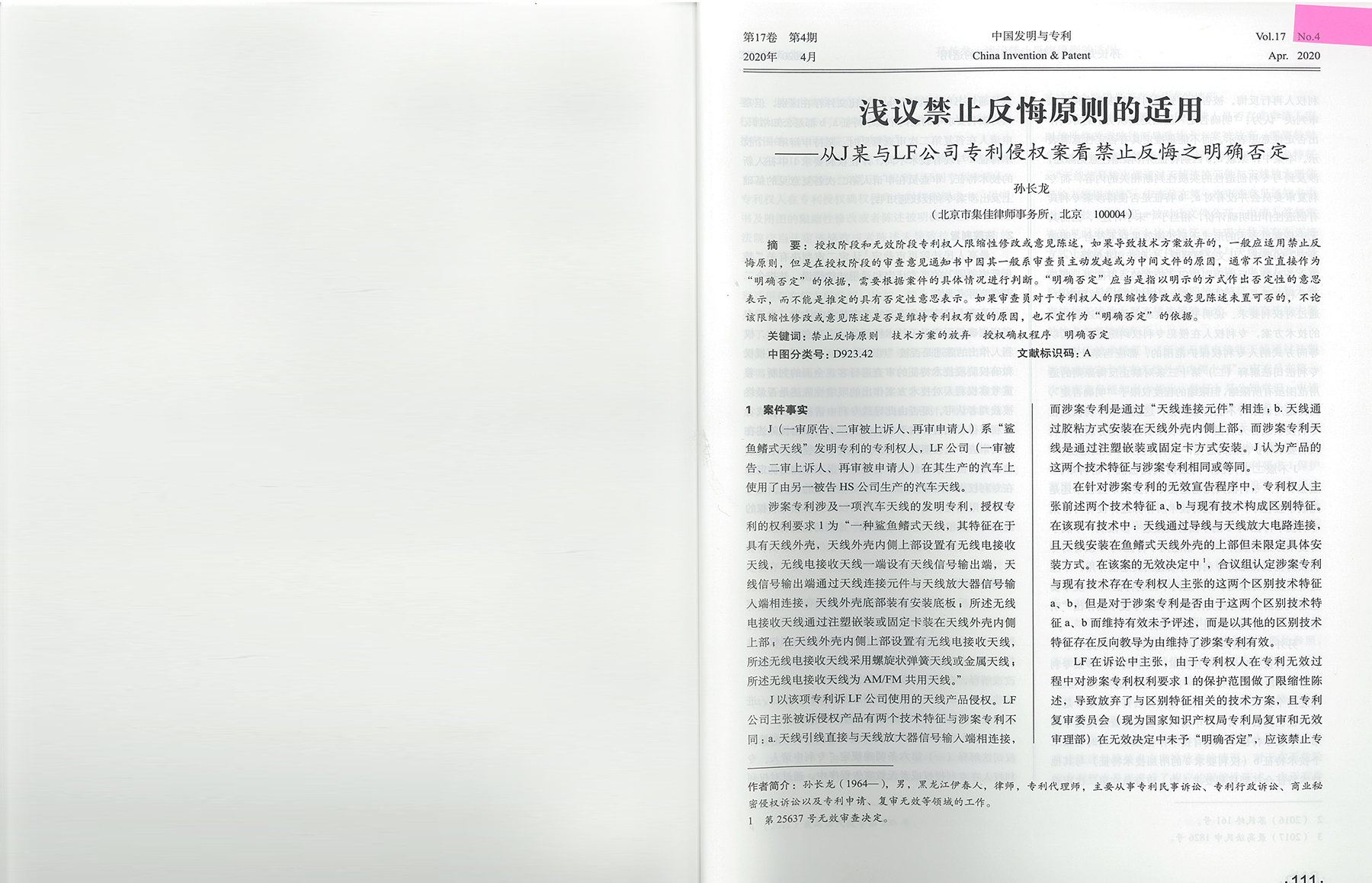 集佳文章《淺議禁止反悔原則的適用——從J某與LF公司專利侵權案看禁止反悔之明確否定》在《中國發明與專利》發表