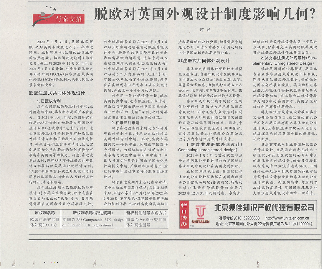 集佳文章《脫歐對英國外觀設(shè)計(jì)制度影響幾何?》在《中國知識產(chǎn)權(quán)報(bào)》發(fā)表