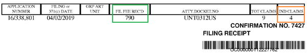 在USPTO發(fā)出的受理通知書上,可以看到官方認定的獨立權利要求數(shù)為4,同時顯示官方收到的申請人費用(綠色方框),參見下圖: