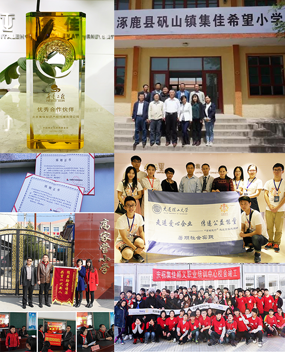 責(zé)任于心,擔當于行。作為一家有溫度的企業(yè),集佳在用心為企業(yè)提供知識產(chǎn)權(quán)保護策略的同時,也一直自覺承擔各項社會責(zé)任,熱心參與各項公益事業(yè),發(fā)揚行業(yè)擔當精神,堅持不懈用愛心回饋社會。尤其是在教育領(lǐng)域,集佳不僅重視專業(yè)人才培養(yǎng),通過愛心獎學(xué)金、集佳班、提供社會實踐等方式與中國政法大學(xué)、同濟大學(xué)、大連理工大學(xué)等眾多高校合作培養(yǎng)知識產(chǎn)權(quán)專業(yè)人才,更是特別關(guān)注青少年的教育和成長。目前,集佳已援建13所希望小學(xué),并多次進行回訪,持續(xù)關(guān)注孩子們的學(xué)習(xí)和成長,了解學(xué)校和孩子們的真實所需,提供最有效的幫助。同時,集佳設(shè)立了多項助學(xué)基金,對多所小學(xué)、中學(xué)、技術(shù)學(xué)校等提供幫扶。集佳期望,通過一點一滴的幫助,讓孩子們的生活和學(xué)習(xí)更加豐富多彩,讓他們感受著愛的力量,懷抱希望,用優(yōu)異的學(xué)業(yè)報效祖國,用同樣的關(guān)愛回報社會。