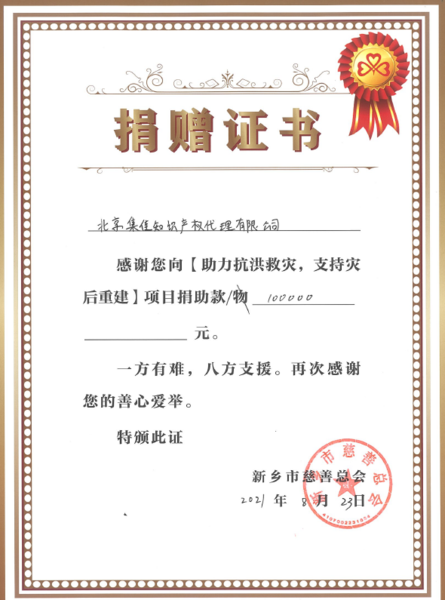 風雨無情人有情,一方有難,八方支援。災情發生后,集佳迅速響應號召,通過中共首都知識產權服務業協會委員會向河南受災地區捐贈10萬元,用于支援抗汛和災后重建工作。許多集佳員工也在第一時間獻出愛心,自發向災區捐款捐物,幫助受災群眾渡過難關,重建家園。