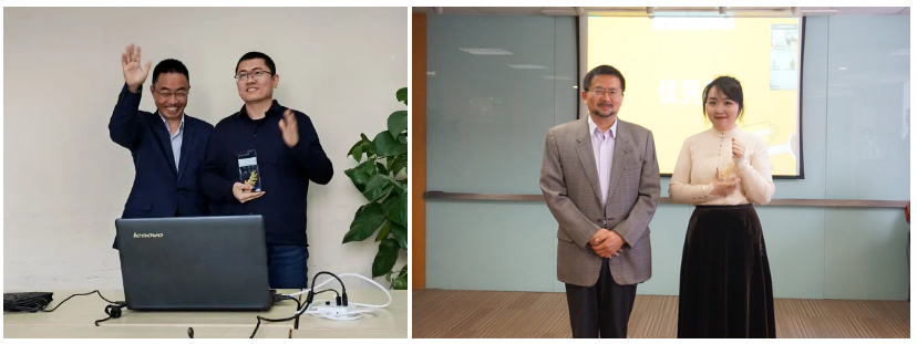▲ 楊林森老師為姚文杰頒獎(遠程會議連線)                        ▲丁永凡老師為蔣靜靜頒獎