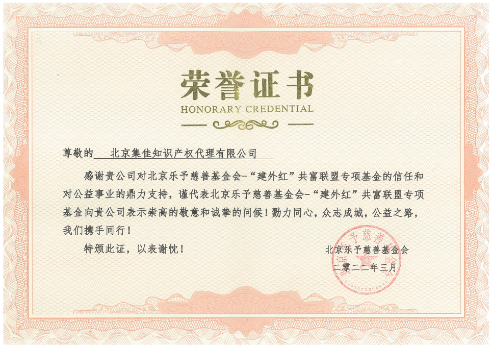 近日,集佳收到北京樂予慈善基金會頒發的榮譽證書,感謝集佳鼎力支持“建外紅”共富聯盟慈善公益項目,積極捐贈善款,參與幫扶活動。