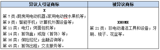 案例二:“X”商標(07;09;11;14;35;36;37;38;41;42;45類) Vs.“ XHOME”(21類)