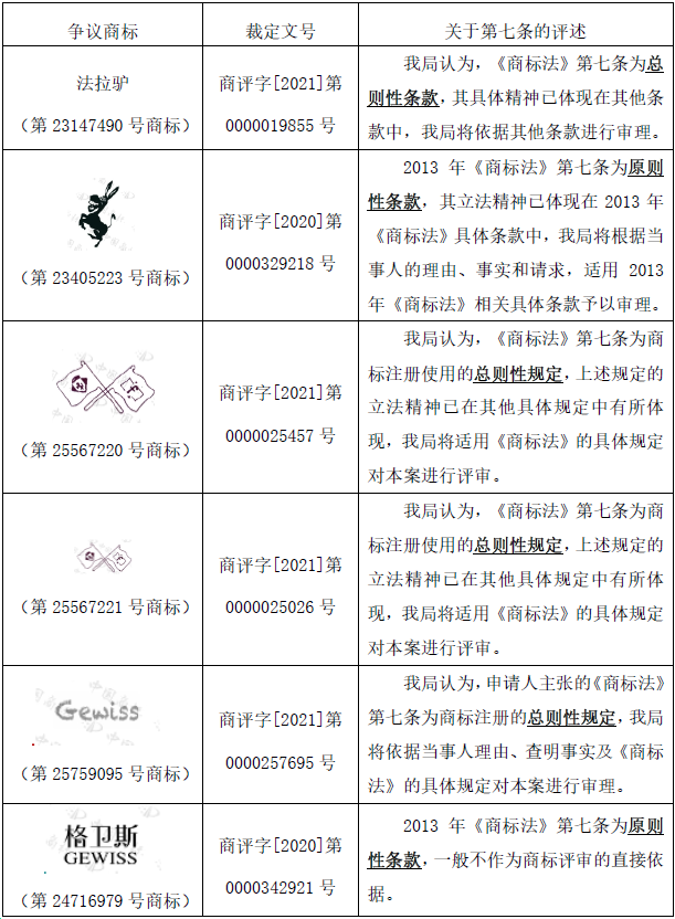 而在過往大多數異議、無效宣告案件中,“誠實信用原則”都被評價為“總則性條款”“原則性條款”,例如,下表所列的6件無效宣告案件均將申請人基于第七條的評審請求評述為“總則性條款”,認為誠實信用原則具體精神已體現在其他條款中,案件需依據其他具體性條款進行評價: