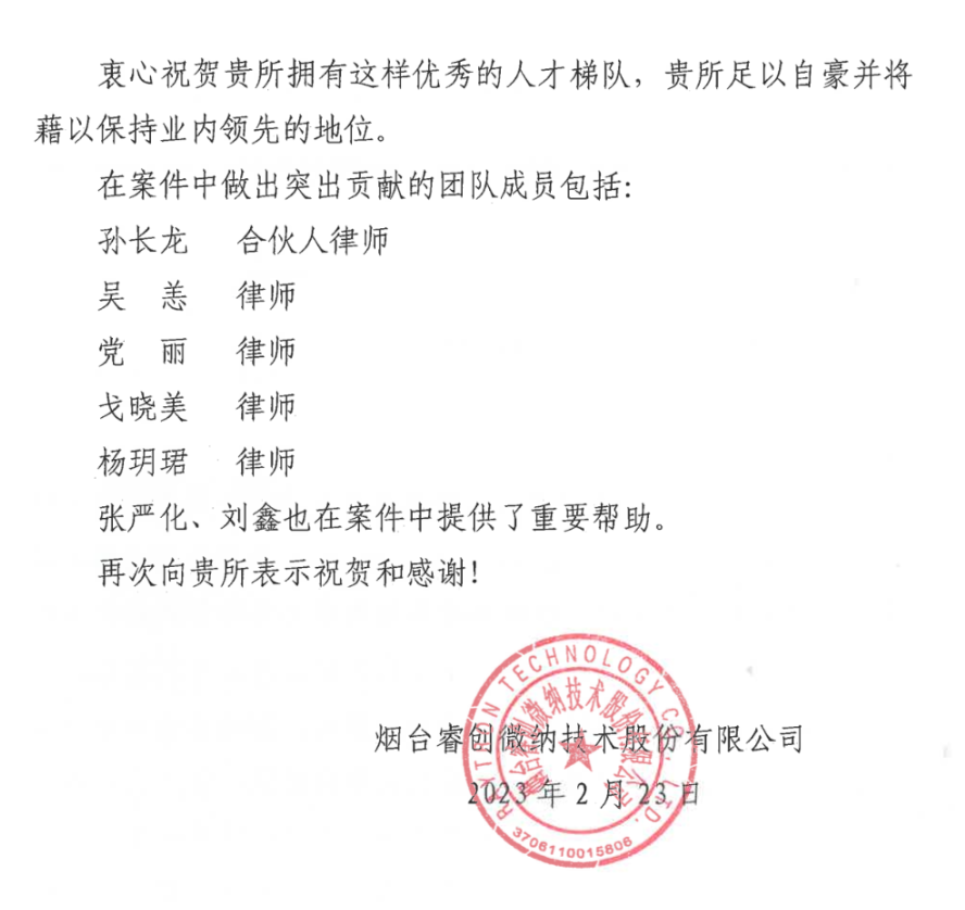 Unitalen Law Office assisted Raytron in winning the final victory in the patent infringement lawsuits and the malicious litigation case, which not only safeguarded Raytron's lawful rights and interests, but more importantly, restrained the abuse of right to sue by the unfair competitor for seeking unlawful interests, and made outstanding contributions to maintaining a good business environment.