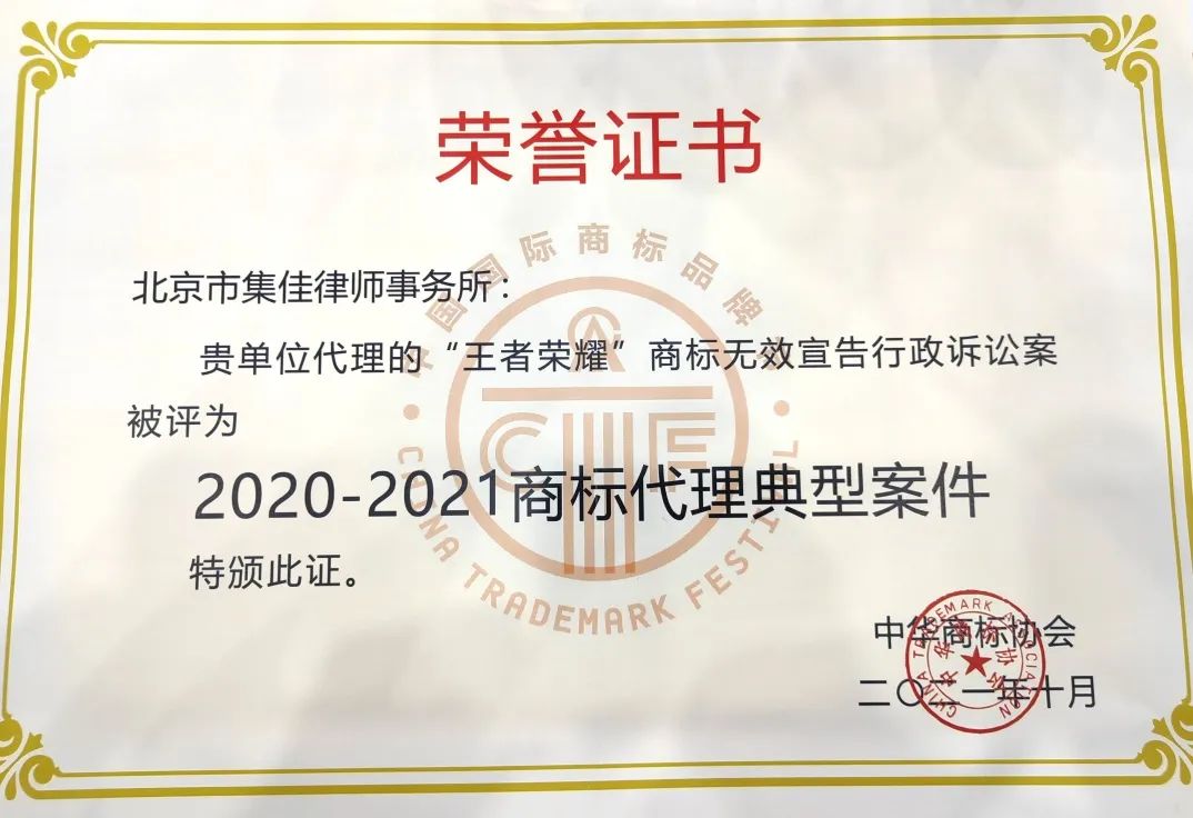 6月17日,第十三屆中國國際商標(biāo)品牌節(jié)正式拉開帷幕,各項活動火熱進行。在“商標(biāo)典型案例評析論壇”上,集佳律師事務(wù)所代理的“第33類‘王者榮耀’無效宣告行政訴訟案”和“OPPO侵權(quán)案”因其體現(xiàn)出的創(chuàng)新性、實效性、典型性和影響力,在眾多案例中脫穎而出,雙雙入選“2020-2021商標(biāo)代理典型案件”。