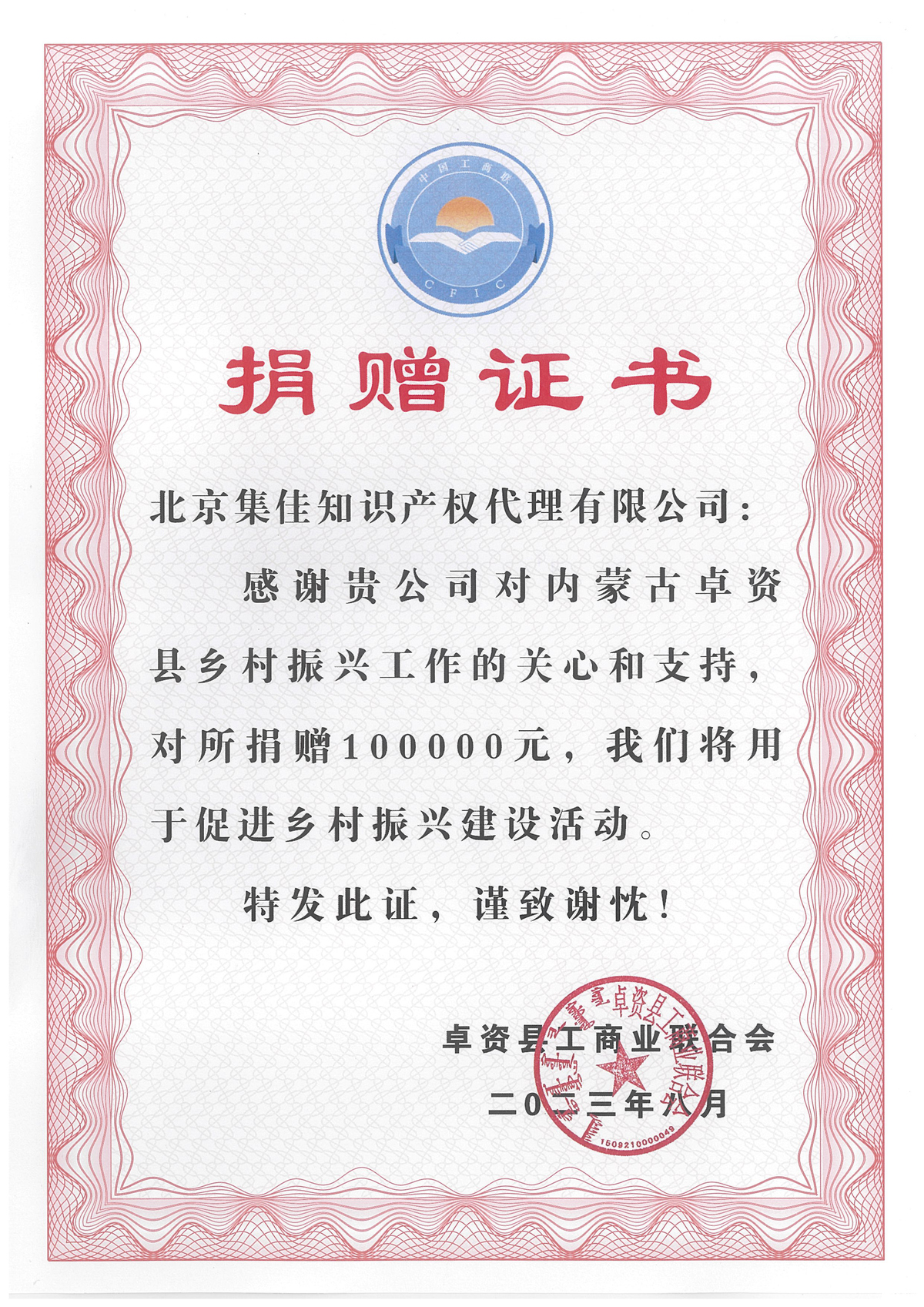為進一步促進京蒙對口幫扶協(xié)作工作,近日,集佳積極響應朝陽區(qū)工商聯(lián)的倡議,參加京蒙對口幫扶考察工作,并捐資10萬元支持內蒙古自治區(qū)烏蘭察布市卓資縣鄉(xiāng)村振興建設。