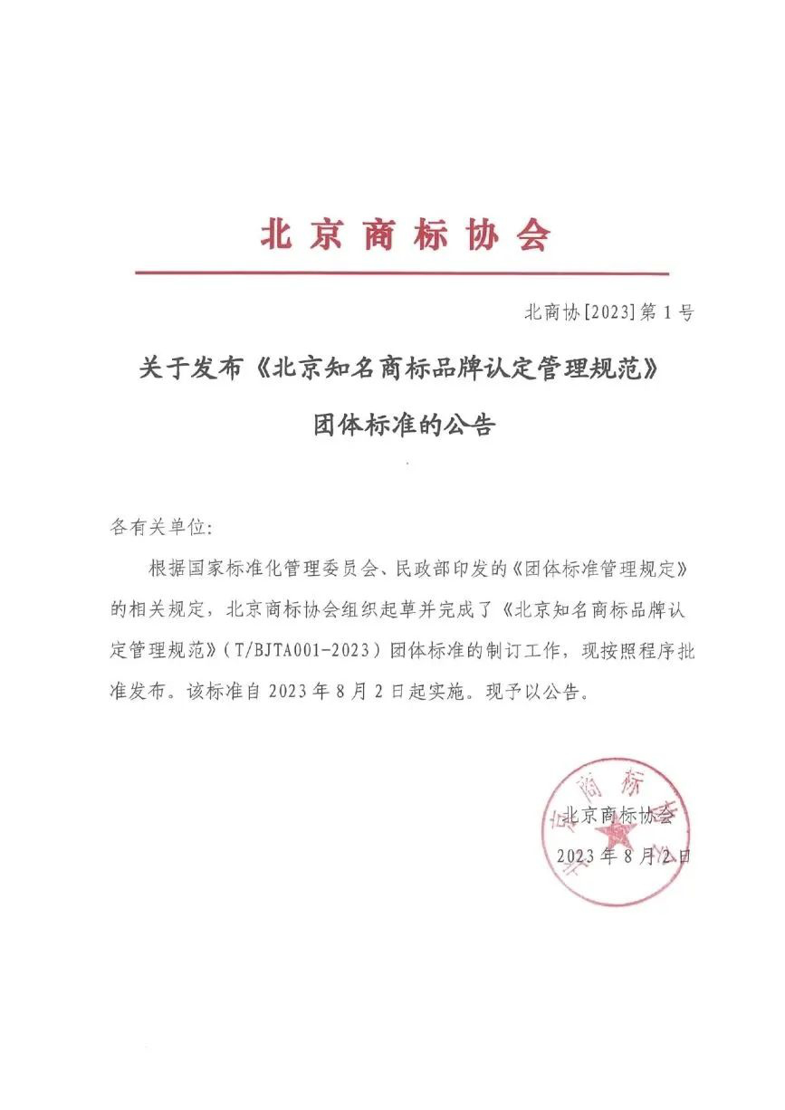 為保護北京知名商標品牌的權利人、使用者和消費者的合法權益,提升商標品牌價值,促進企業提質增效,同時為貫徹國家知識產權局《深入實施〈關于強化知識產權保護的意見〉推進計劃》的政策精神,把北京打造成國內及國際商標品牌保護的新高地,將北京品牌推向全國及世界,塑造北京商標品牌保護高水平、高質量發展的新形象,北京商標協會根據《中華人民共和國商標法》《中華人民共和國標準化法》等有關法律法規的規定,經反復討論分析,起草了《北京知名商標品牌認定管理規范》(討論草案),并多次組織相關專家學者就內容進行論證,廣泛征詢各個行業的意見,積極采納相關修改建議,最終形成《北京知名商標品牌認定管理規范》(T/BJTA 001-2023),該標準自2023年8月2日實施。