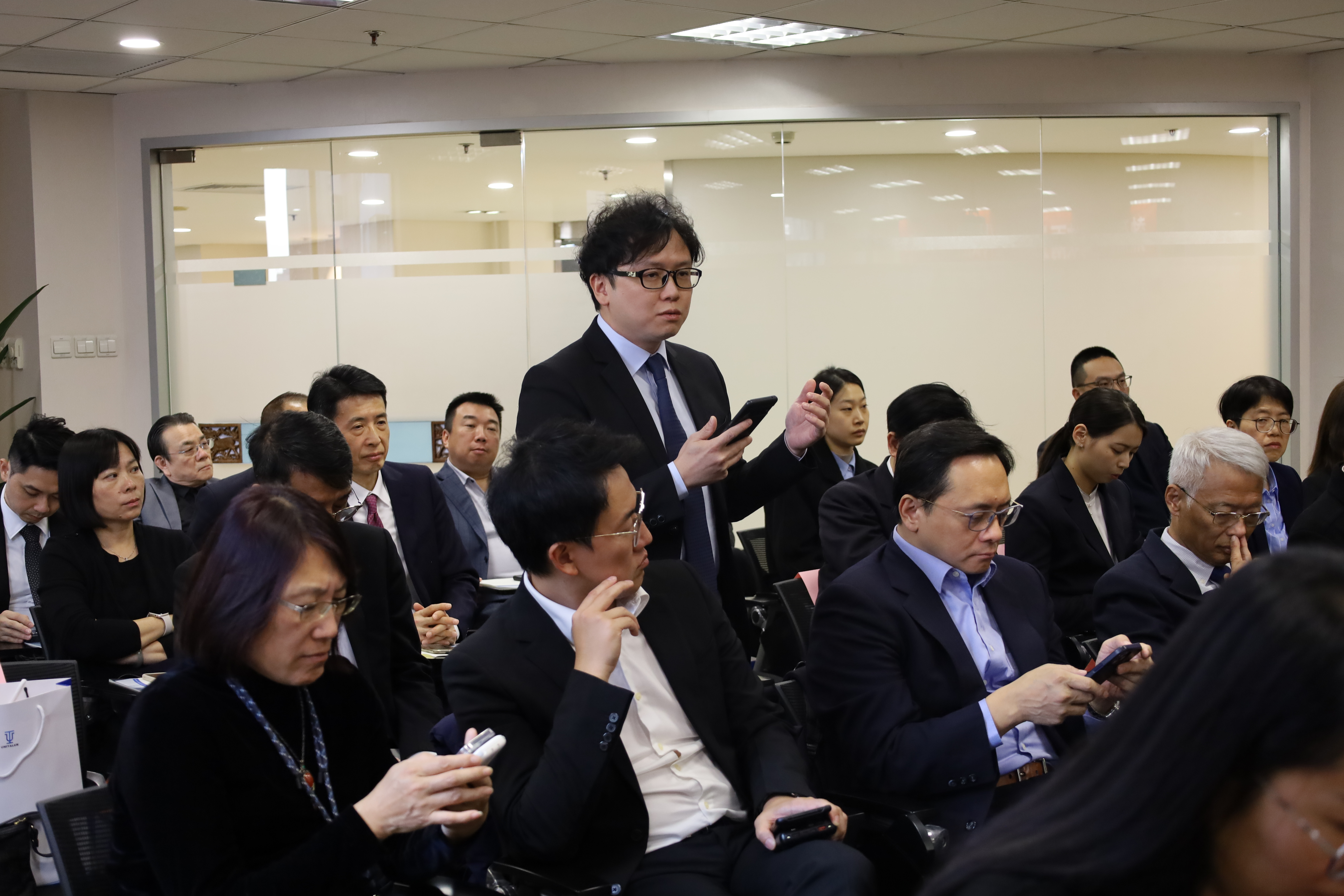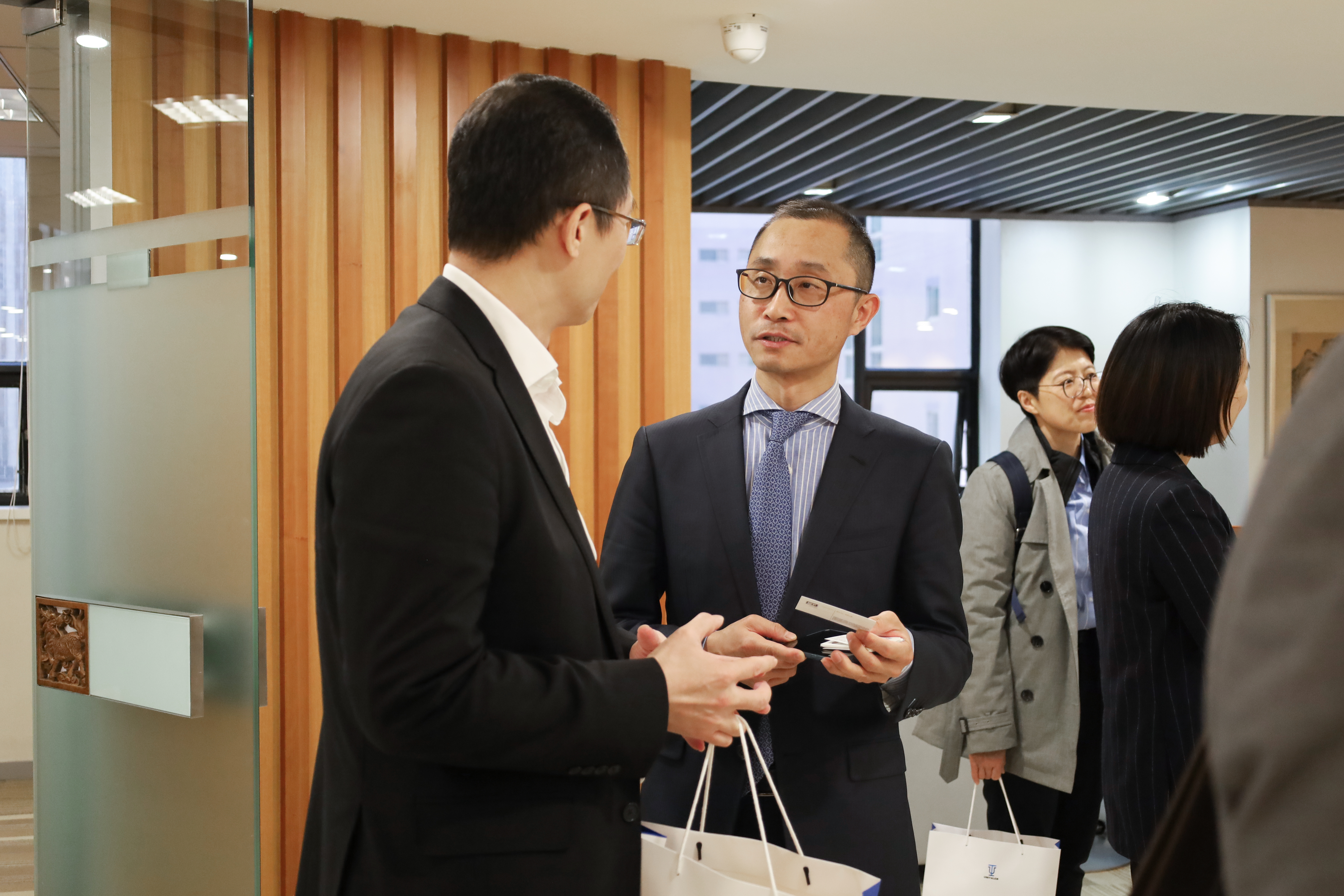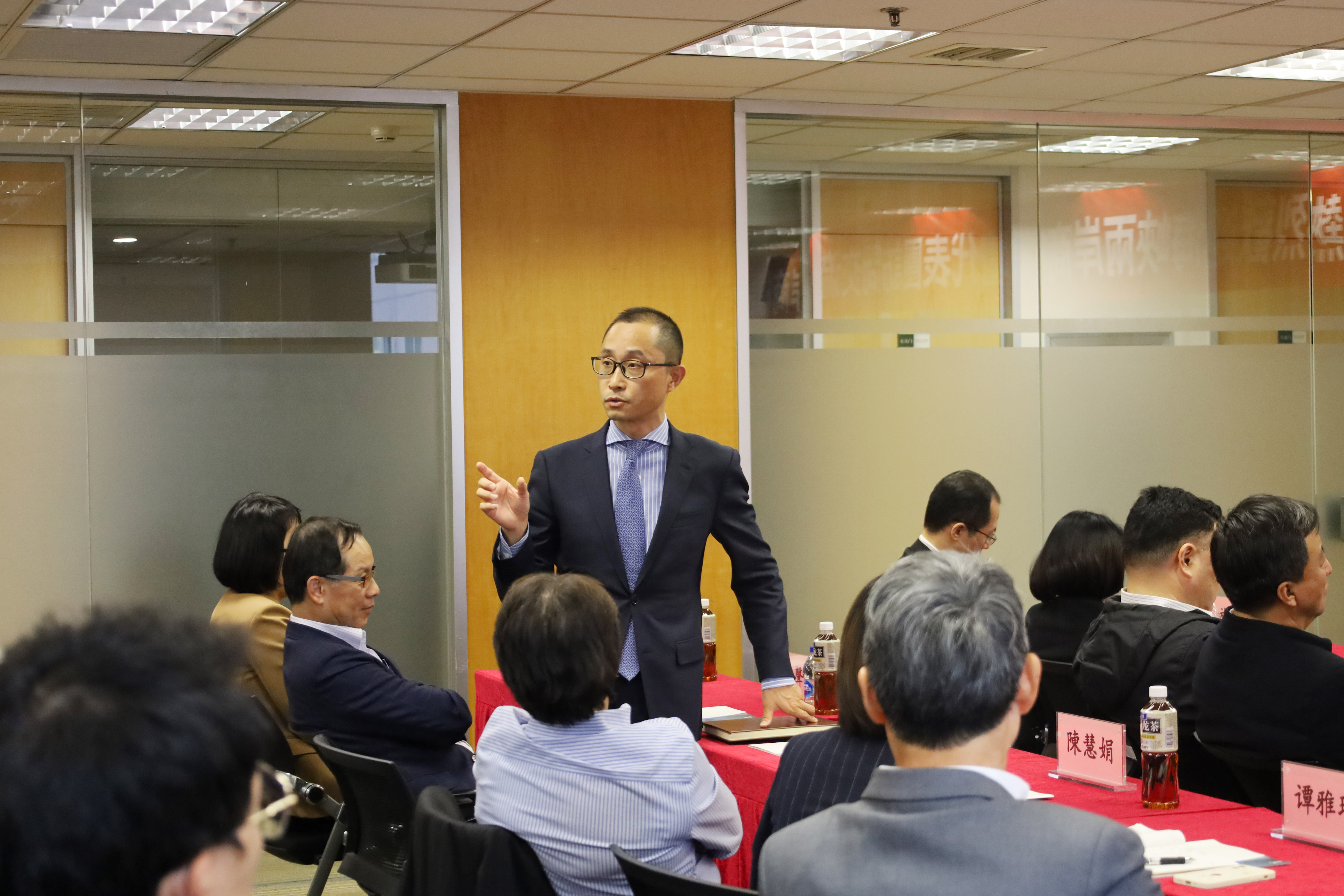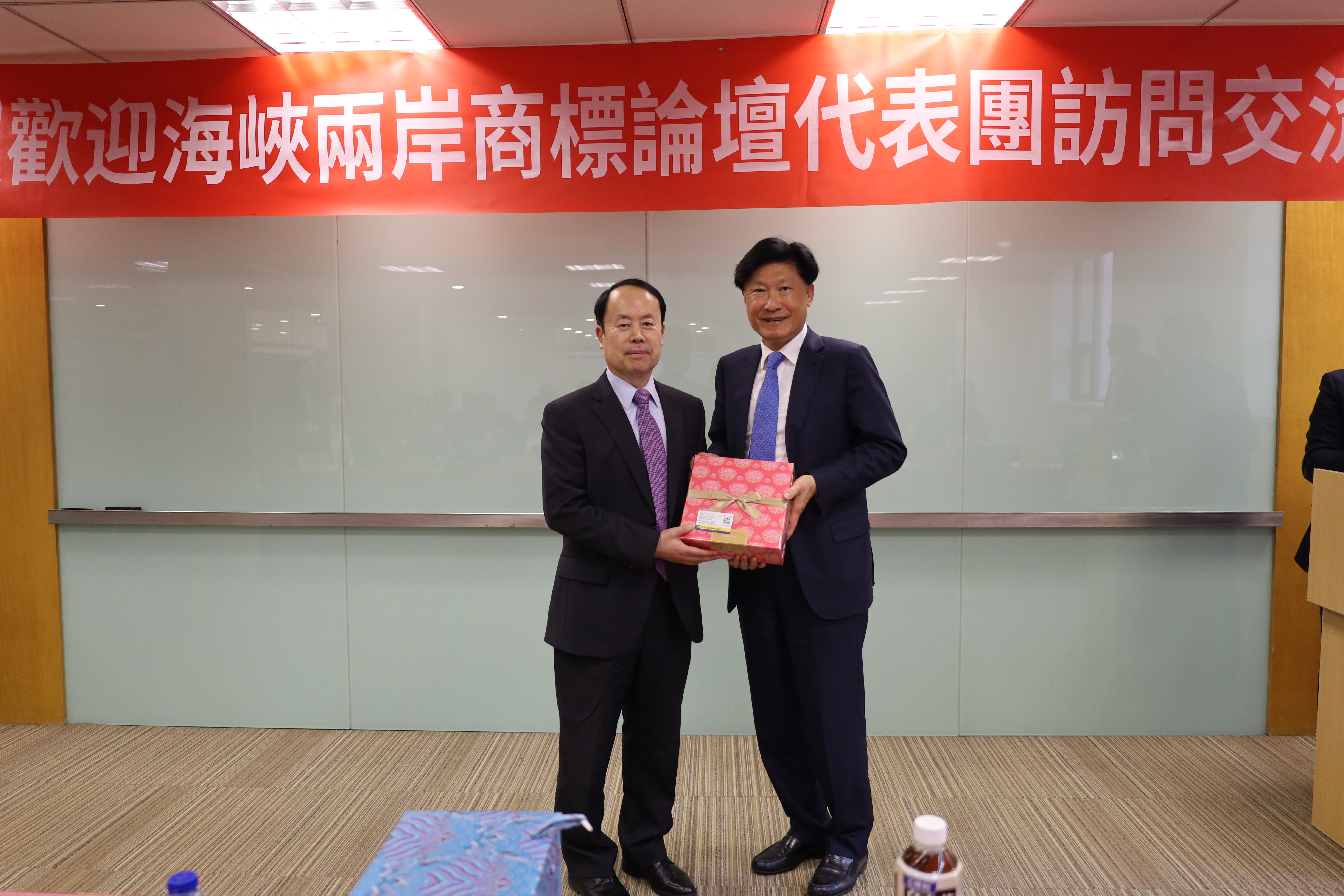 于澤輝所長對代表團蒞臨集佳考察表示熱烈歡迎,并與海商會副會長王桂良先生、副會長兼秘書長黃旭昇先生互相交換禮物。