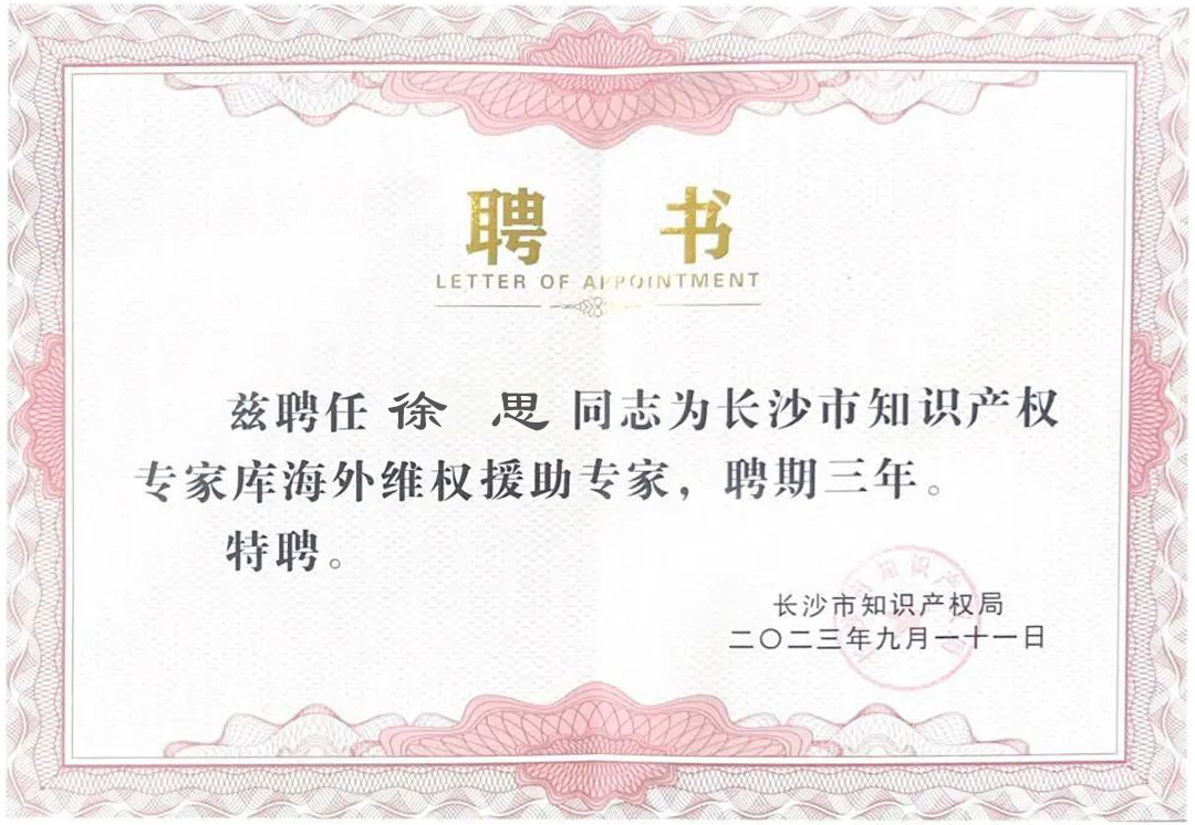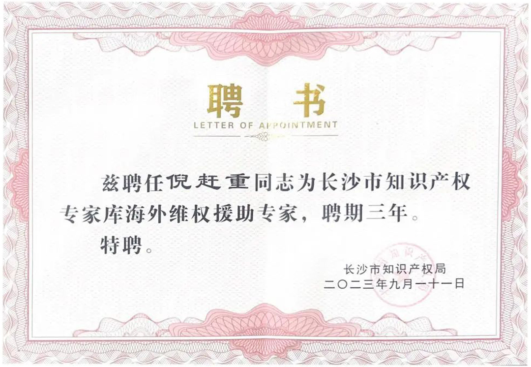 近期,長沙市知識產權局公布了第二批長沙市海外知識產權維權援助專家名單,集佳趙雷、朱剛琴、徐思、倪趕重4位專家入選。