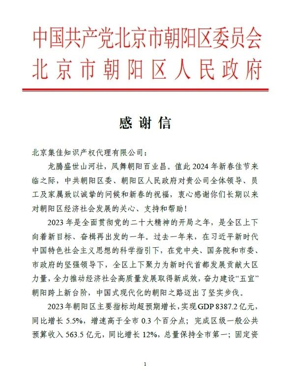 集佳的成長和發展始終受益于朝陽區良好的營商環境。感謝朝陽區委、區政府一直以來對集佳的關懷和支持,收到感謝信,集佳深感榮幸,也備受鼓舞。在朝陽區各級領導部門的大力支持下,集佳將繼續發揮企業擔當,肩負起更多社會責任,推動更多行業內的交流與合作,為北京市朝陽區乃至全國的知識產權發展貢獻自己的力量。