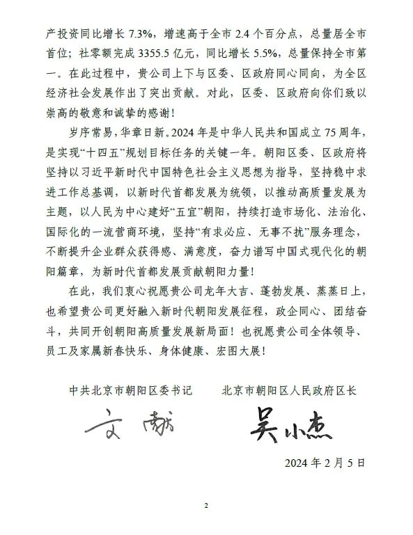 新春佳節來臨之際,集佳收到北京市朝陽區委、區政府發來的感謝信。信中,區委、區政府肯定和感謝了集佳過去一年為朝陽區經濟社會發展作出的貢獻,并對集佳全體領導、員工及家屬致以誠摯的問候和新春的祝福!