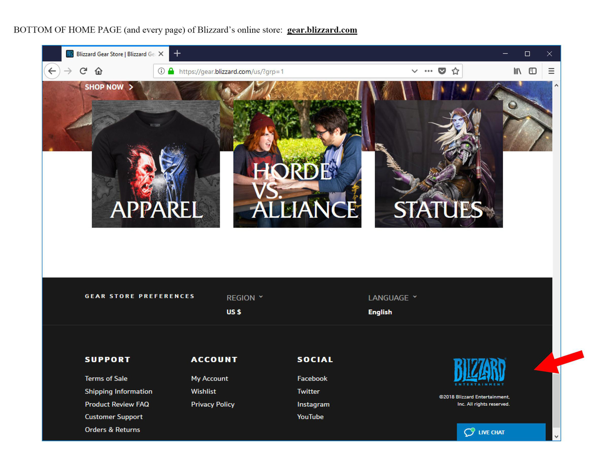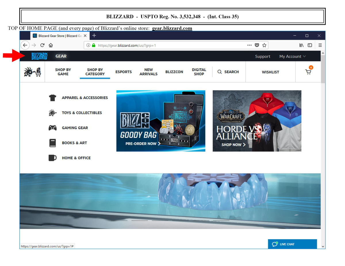 關(guān)于商標申請人關(guān)注的自營商店證據(jù)能否作為第35類使用證據(jù)被美國專利商標局接受這一問題。前文提及Blizzard面對Ava Labs提出的反訴理由曾主張其提交的使用證據(jù)是否存在瑕疵是審查員和申請人之間的問題,言外之意即是強調(diào)其提交的使用證據(jù)已被美國專利商標局審查員認可為合格的第35類使用證據(jù)。當前實踐中,審查員大部分情況下會接受申請人在自己官網(wǎng)使用申請商標零售自己產(chǎn)品的證據(jù)。作為參考,以下為Blizzard于2018維護其商標注冊時提交的第35類零售商店服務使用證據(jù),已被接受: