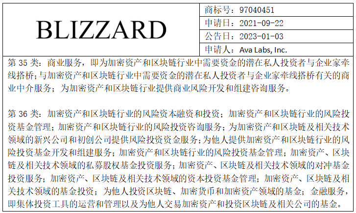 此次異議爭議源于Ava Labs向美國專利商標局申請注冊“BLIZZARD”商標,申請覆蓋與區(qū)塊鏈相關(guān)的第35類商業(yè)服務和第36類金融服務。經(jīng)初步審定,商標公告信息如下: