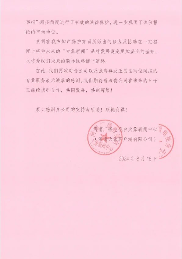 近日,我們收到河南廣播電視臺大象新聞中心(河南大象客戶端有限公司)的感謝信,對集佳在知識產權方面給予的專業支持與優質服務表示衷心感謝,并熱情稱贊集佳河南分公司張海燕王晶晶在服務中展現出的“不拋棄、不放棄”的鉆研精神與專業細致的工作態度!