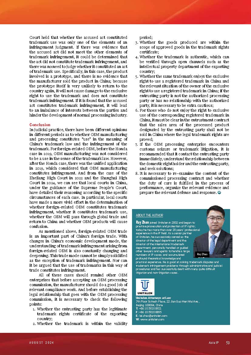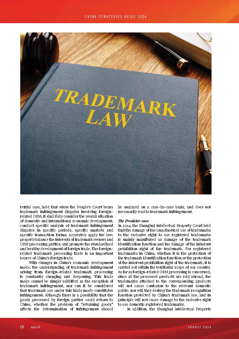 集佳文章《DOES FOREIGN-RELATED ORIGINAL EQUIPMENT MANUFACTURING CONSTITUTE TRADEMARK INFRINGEMENT IN CHINESE JUDICIAL PRACTICE?》在《Asia IP AUGUST 2024》發表