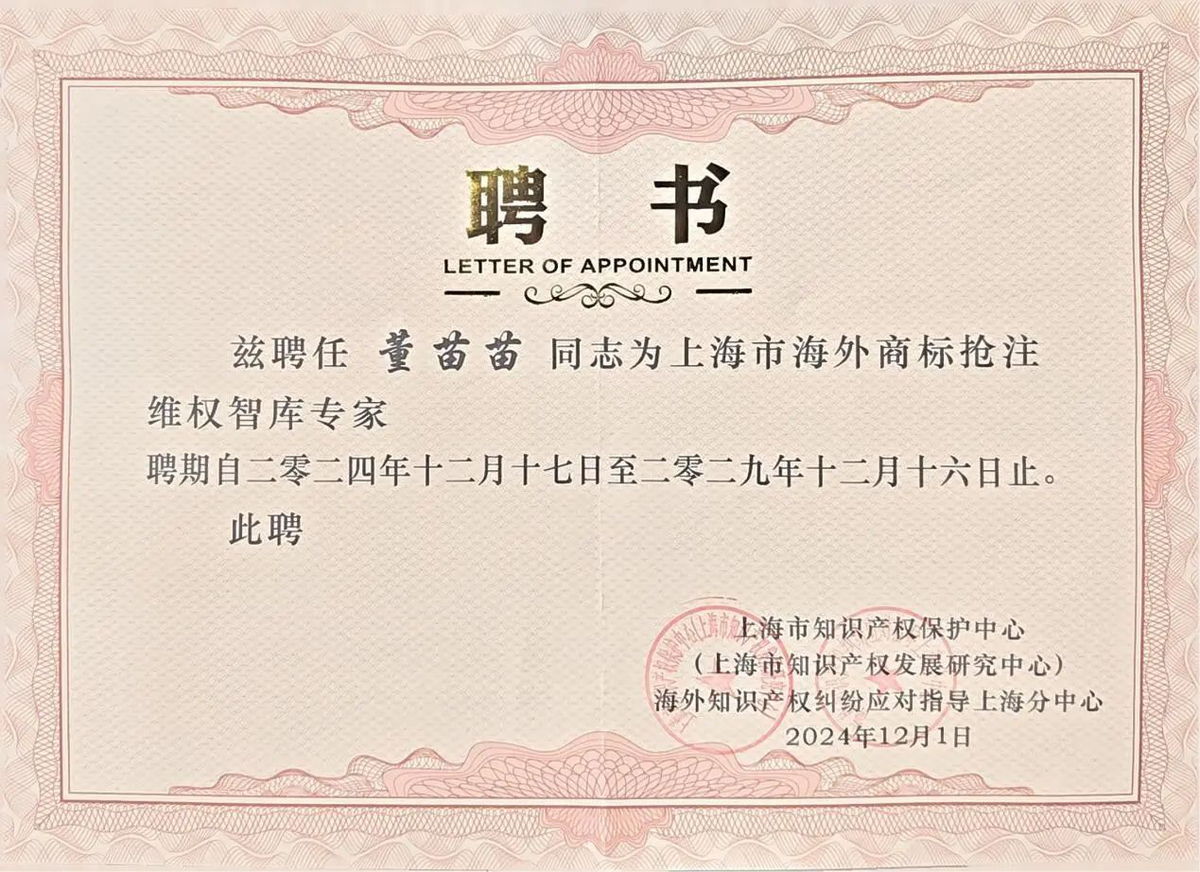 董苗苗律師從眾多候選人中脫穎而出,被聘任為上海市海外商標(biāo)搶注維權(quán)智庫專家。